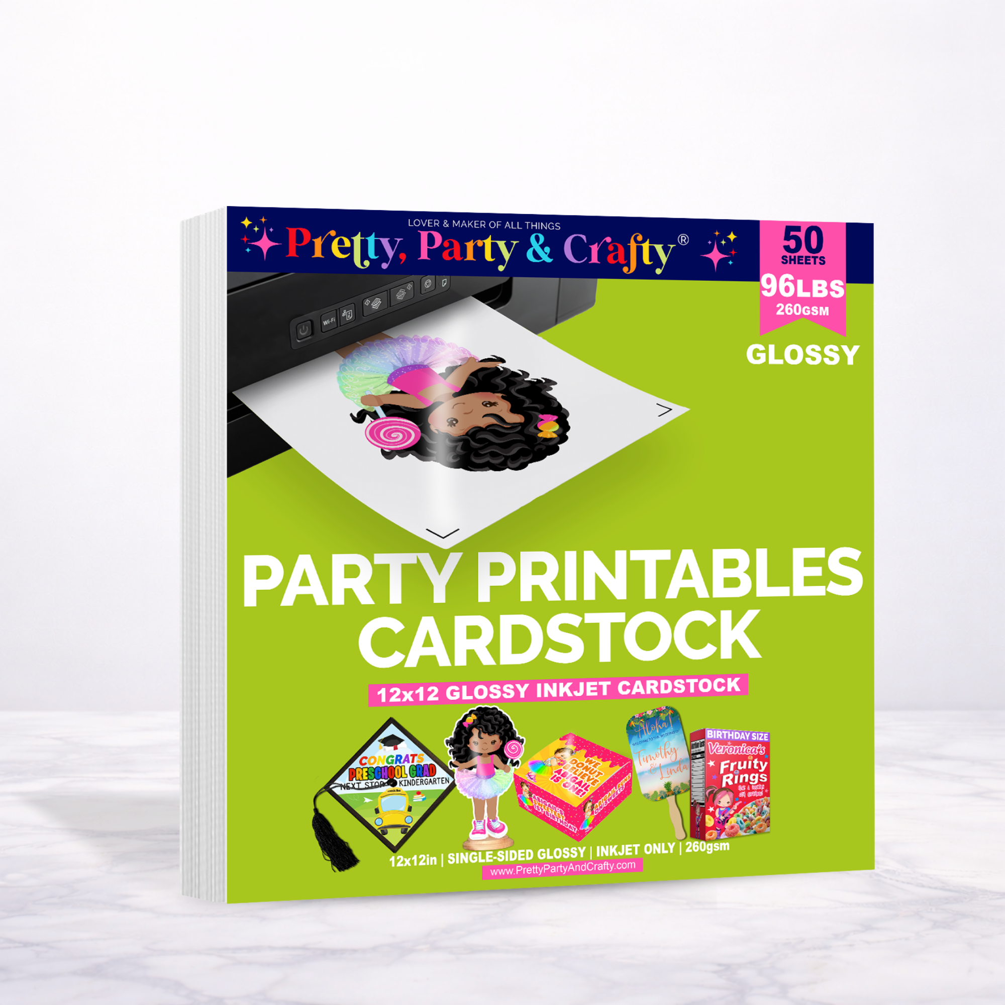 Our printable 96lb white 12x12 glossy cardstock is perfect for custom party favor boxes, fans, scrapbooking and more. Compatible with wide-format inkjet printers only that can handle 260gsm weight paper. Printer must have rear paper feeder.